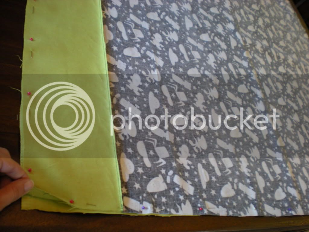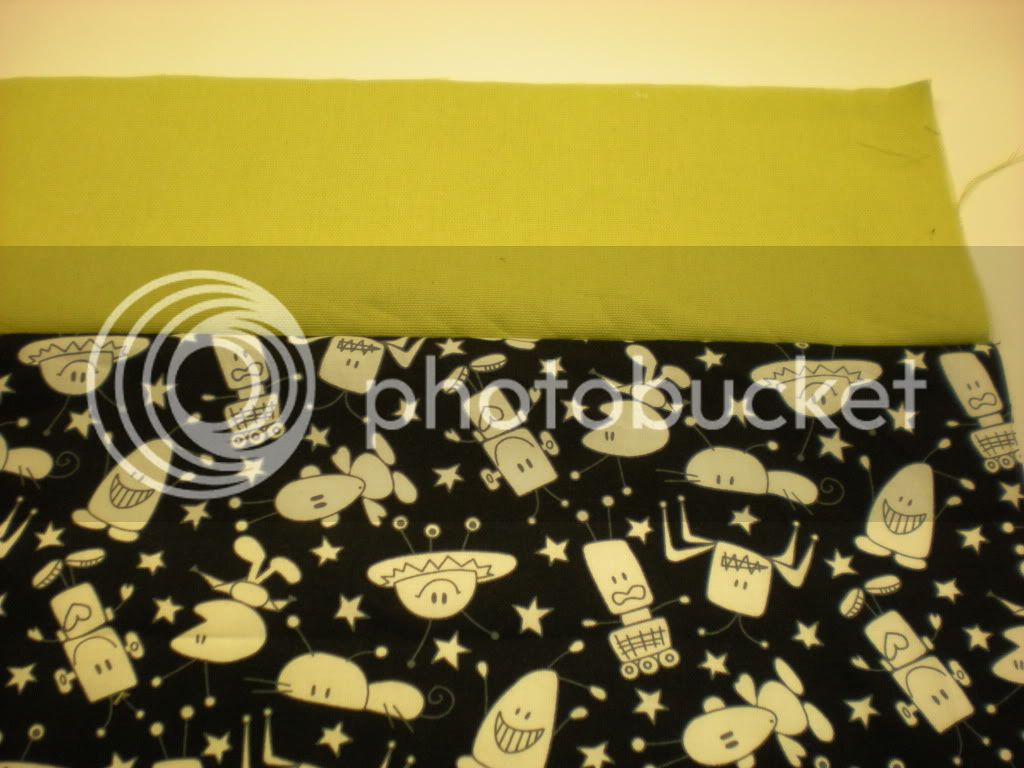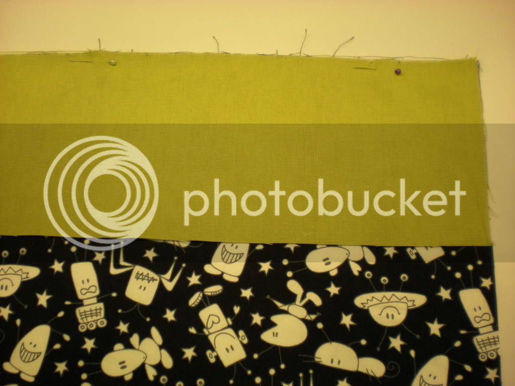 – Lay your front fabric out on your work surface so that the good side of the fabric is facing you. Now lay your accent fabric piece (35″ x 6-1/4″) on top of your main fabric piece overlapping the bottom edge making sure that the wrong side of the accent fabric is facing you. Pin the two fabrics together along the 35″ cut edge side.