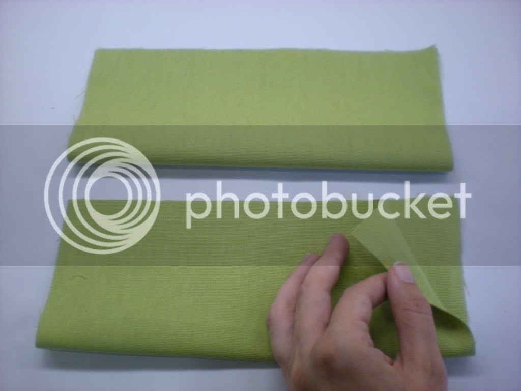 – Take your two car seat strap fabric pieces and fold them in half lengthwise. Make sure that the wrong side of the fabric is showing on both sides.