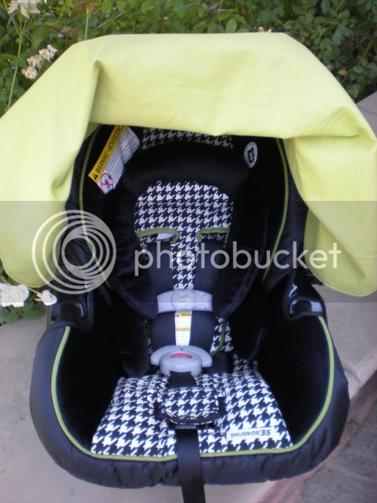This time I decided to add to my list of DIY projects and sew my own Infant Car Seat Tent Cover. It was super easy and I loved that I could pick out the exact fabrics that I wanted that coordinated with the car seat. I picked a cute black and white alien fabric for the outside and a lime green solid for the interior. It matches my Logan Graco Snugride perfectly!!!!